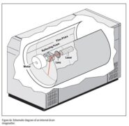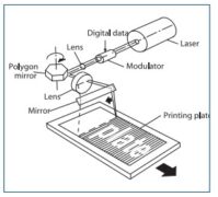 Một gương phản xạ (gương xoay đa giác) xoay với tốc độ cao trên đệm chân không, nguồn phát laser chỉ có một tia duy nhất (single beam). Gương phản xạ di chuyển dọc theo trục ống với bước tăng bằng chiều rộng một đường quét. Gương luôn luôn phản xạ ánh sáng laser chiếu đến nó với một góc bằng 90º lên vật liệu nhạy sáng, vật liệu này được cố định và ép sát vào bề mặt trong của drum nhờ hệ thống hút hơi. Tia laser sẽ được xác định chính xác tiêu cự lên bề mặt vật liệu và ghi một điểm với kích thước điểm theo yêu cầu. Kích thước điểm tram này sẽ thay đổi tùy theo độ phân giải. Khoảng cách giữa bề mặt vật liệu và gương xoay là một hằng số điều này sẽ bảo đảm kích thước điểm cũng như tiêu cự sẽ là như nhau trên toàn bộ bề mặt bản mà không cần một hệ thống quang học đặc biệt.