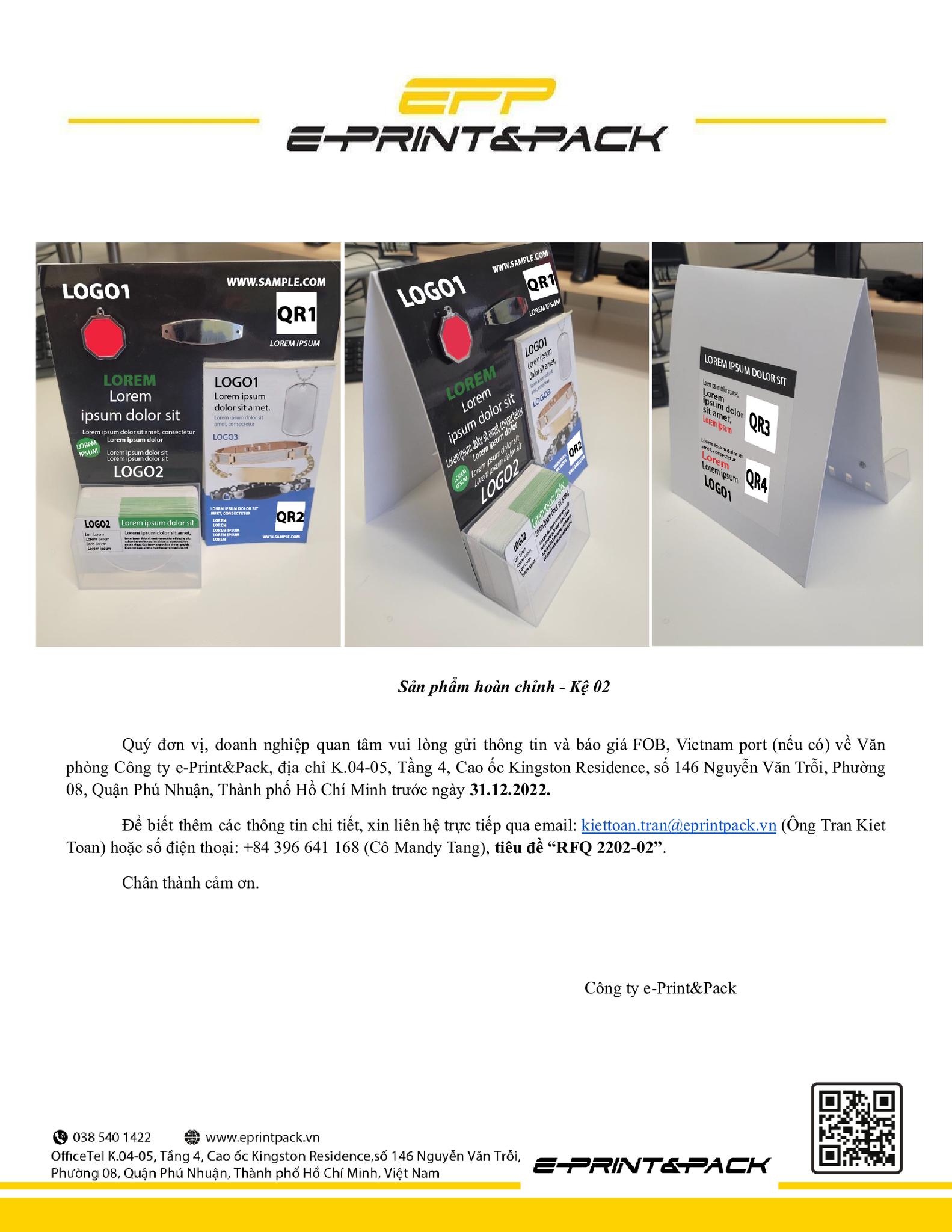 Để biết thêm các thông tin chi chiết, xin liên hệ trực triếp qua email: kiettoan.tran@eprintpack.vn (Ông Tran Kiet Toan) hoặc số điện thoại: +84 396 641 168 (Cô Mandy Tang), tiêu đề:”RFQ 2022-02″.
