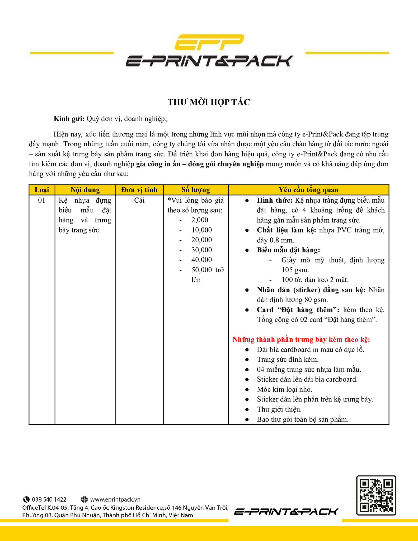 Hiện nay, xúc tiến thương mại là một trong những lĩnh vực mũi nhọn mà công ty e-Print&Pack đang tập trung đẩy mạnh. Trong những tuần cuối năm, công ty chúng tôi vừa nhận được một yêu cầu chào hàng từ đối tác nước ngoài – sản xuất kệ trưng bày sản phẩm trang sức. Để triển khai đơn hàng hiệu quả, công ty e-Print&Pack đang có nhu cầu tìm kiếm các đơn vị,doanh nghiệp gia công in ấn – đóng gói chuyên nghiệp mong muốn và có khả năng đáp ứng đơn hàng với những yêu cầu theo thư mời được đính kèm dưới đây