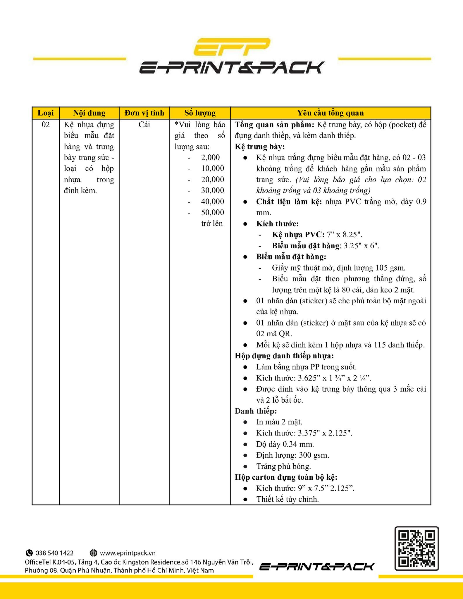 Quý đơn vị, doanh nghiệp quan tâm vui lòng gửi thông tin và báo giá FOB, Vietnam port (nếu có) về Văn phòng Công ty e-Print&Pack, địa chỉ K.04-05, Cao ốc Kingston Residence, số 146 Nguyễn Văn Trỗi, Phường 08, Quận Phú Nhuận, Thành phố Hồ Chí Minh trước ngày 31.12.2022