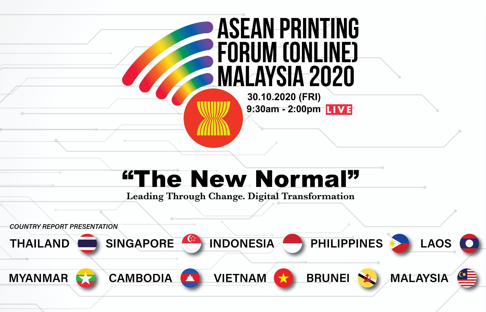 Ngày thứ Sáu 30 tháng 10 năm 2020, vào lúc 9:30 giờ Malaysia (tức 8:30 giờ Việt Nam), sẽ diễn ra Hội nghị trực tuyến Ngành In các Nước Asean với chủ đề “Printing Industry’s Trend – “THE NEW NORMAL” Leading Through Change : Digital Transformation.