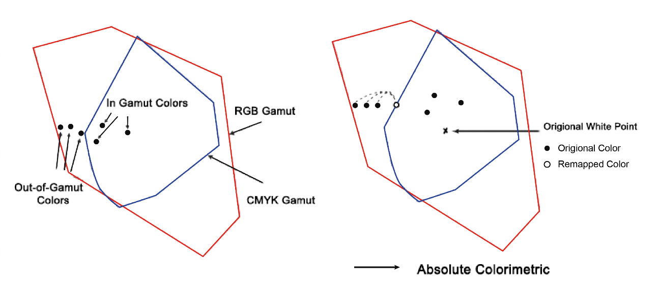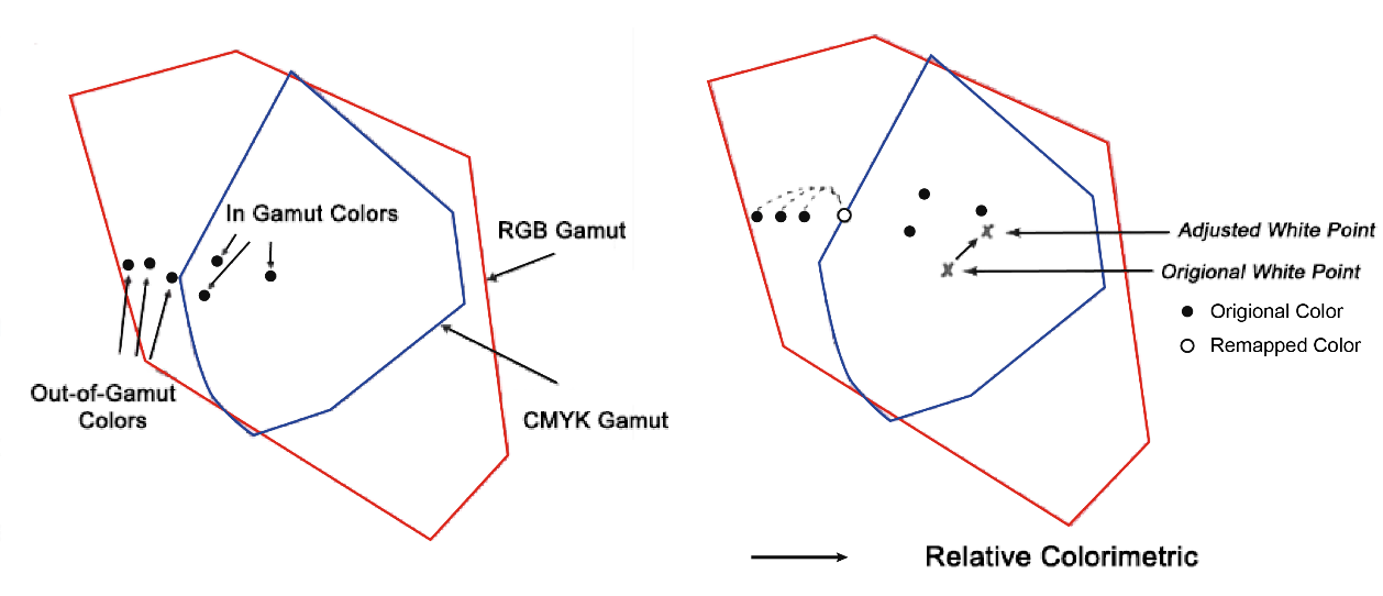 - Relative Colorimetric – Phục chế tương đối: tất cả các màu nằm trong không gian màu gốc (Input) và không gian màu đích (output) sẽ giữ nguyên; các màu nằm ngoài khoảng phục chế màu sẽ di chuyển về màu gần nó nhất ở rìa gamut (màu bão hòa nhất mà máy có thể in được). Phương pháp này làm thay đổi độ bão hòa của màu sắc, điểm trắng ở output = điểm trắng ở input (Xem Hình 3).