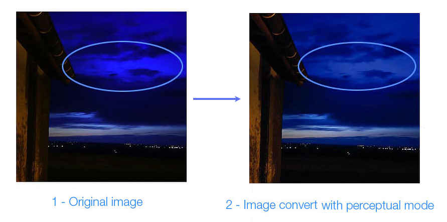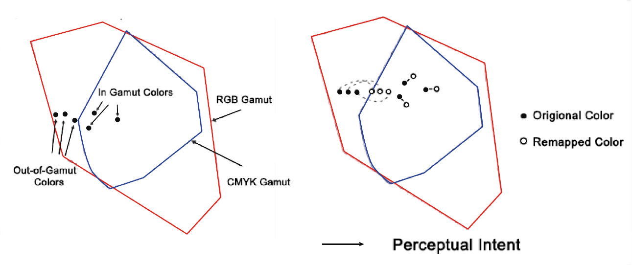 - Perceptual Intent: Phương pháp chuyển đổi phù hợp với sự cảm nhận của mắt người, bảo toàn mối quan hệ về mặt thị giác giữa các màu khi chuyển đổi. Các màu bên ngoài gamut sẽ nén phi tuyến tính vào bên trong rìa của gamut, đồng thời các màu bên trong cũng di chuyển ra. Phương pháp này thay đổi tất cả hoặc phần lớn không gian màu gốc nhưng mối liên hệ giữa chúng không đổi, giúp duy trì cân bằng xám, bảo toàn được tông màu nhưng mất đi độ tương phản (Xem Hình 7, Hình 8).