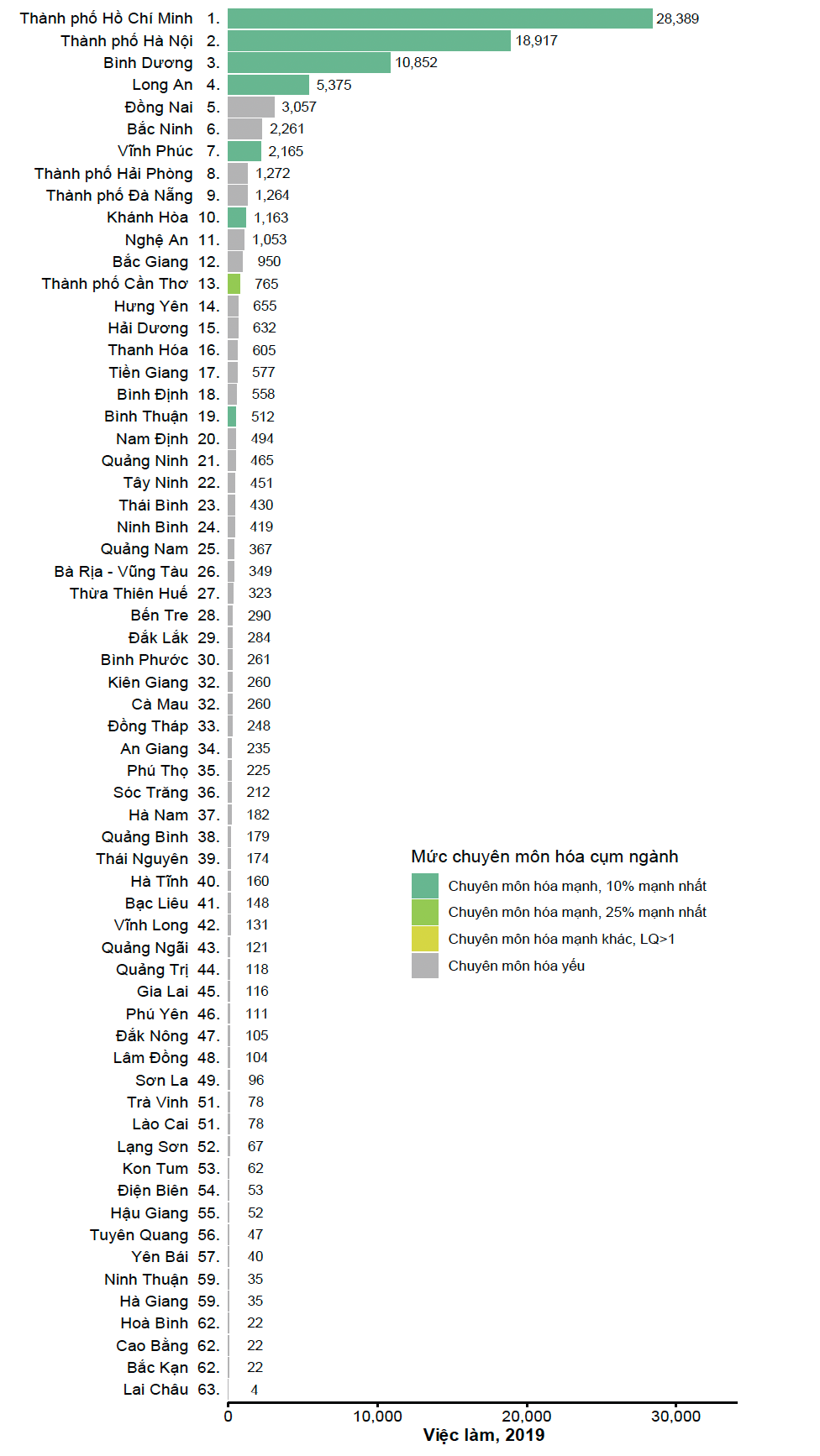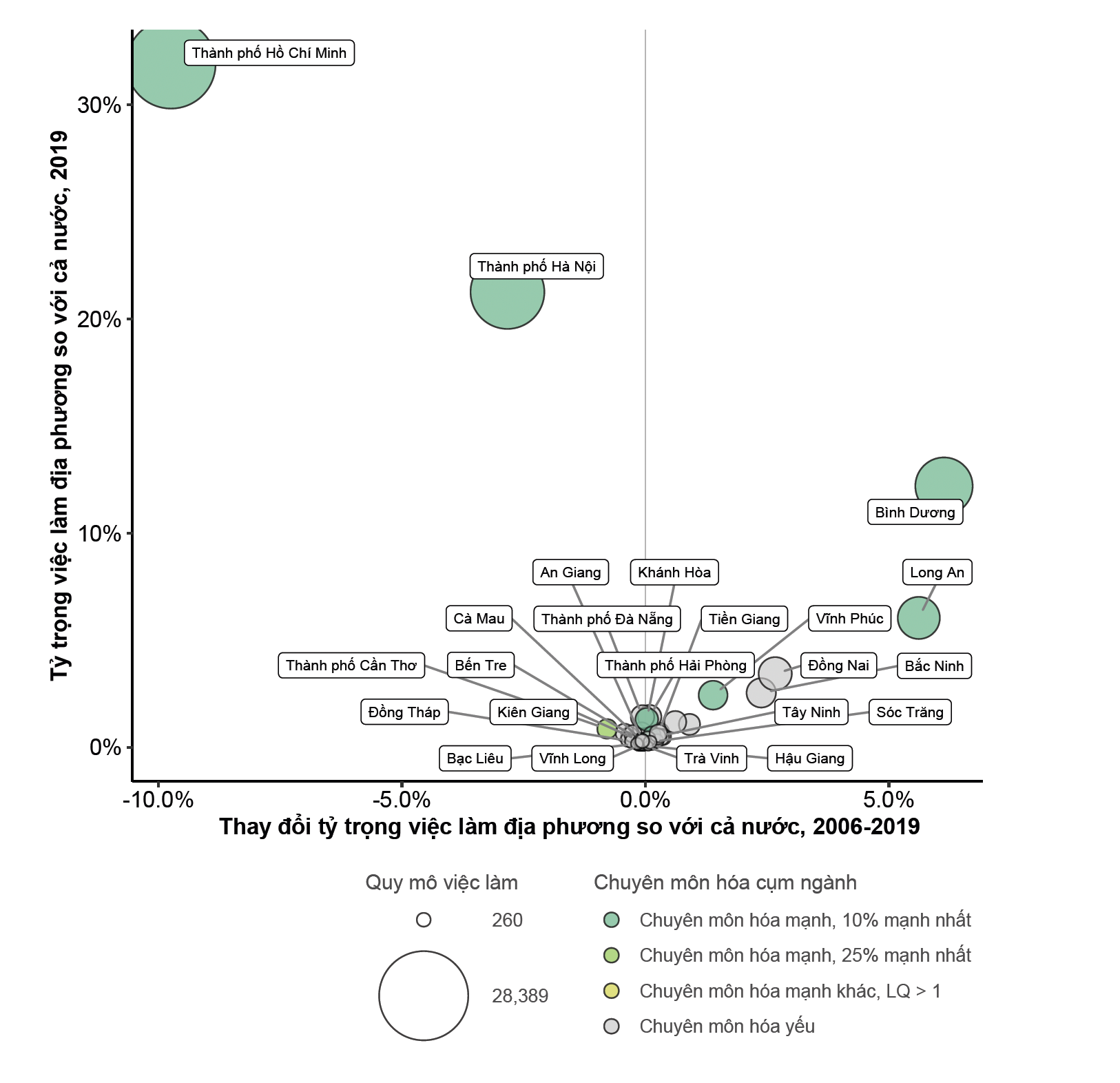 Tính năng động của các tỉnh đối với một cụm ngành được kết hợp xác định bằng tỷ trọng của việc làm của địa phương so với cả nước đối với cụm ngành vào thời điểm 2019 và sự thay đổi tỷ trọng đó trong khoảng thời gian 2006-2019. Như được biểu thị trong Hình 4.4, các tỉnh có tính năng động cao đối với cụm ngành này ở bên phải trục tung, bao gồm Bình Dương, Long An, Đồng Nai, Bắc Ninh, Vĩnh Phúc v.v. Các tỉnh kém năng động nằm ở bên trái trục tung, có tỷ trọng việc làm địa phương so với cả nước giảm trong giai đoạn 2006-2019, bao gồm Thành phố Hồ Chí Minh và Thành phố Hà Nội, mặc dù đây là hai địa phương có mức độ chuyên môn hóa cụm ngành cao, và mức lao động cụm ngành cao nhất cả nước.