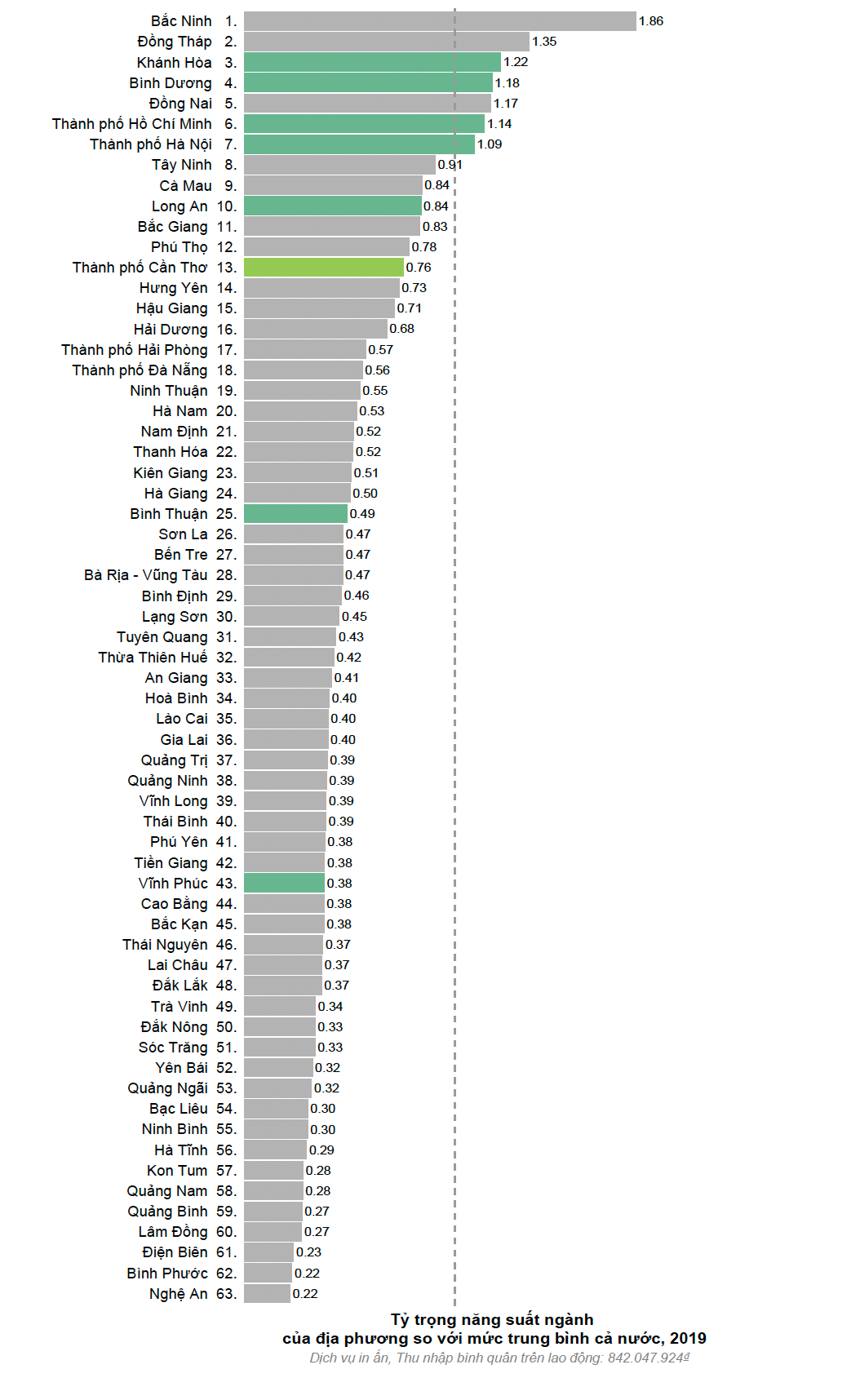 Các tỉnh có năng suất cụm ngành dịch vụ in ấn cao hơn mức năng suất cụm ngành trung bình cả nước bao gồm Bắc Ninh, Đồng Tháp, Khánh Hoà, Bình Dương, Thành phố Hồ Chí Minh và Thành phố Hà Nội (2019).
