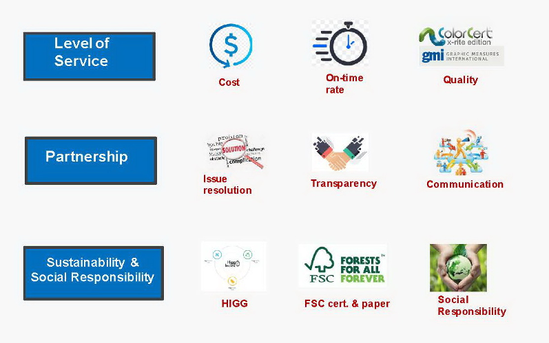 “Cost – Giá” là yếu tố thuần túy thương mại. Dù xuất khẩu hay nội địa thì khách hàng luôn tìm kiếm giá tốt. Có thể thấy tỷ xuất lợi nhuận của in xuất khẩu có thể cao hơn nội địa nhưng nó tồn tại khả năng trả hàng rất cao nếu chúng ta không tuân thủ các quy định. Ba tiêu chí: Giá – Giao hàng đúng hạn – Chất lượng là các tiêu chí được đánh giá định kỳ thường là hàng quý. Tùy theo mức đạt được chúng ta sẽ được dồn nhiều đơn hàng hơn hay chấm dứt đặt hàng. Các chương trình đánh giá này được các công ty kiểm định bên thứ ba tiến hành và phụ thuộc vào chủ sở hữu nhãn hiệu. Nó rất khác nhau giữa các hệ thống.