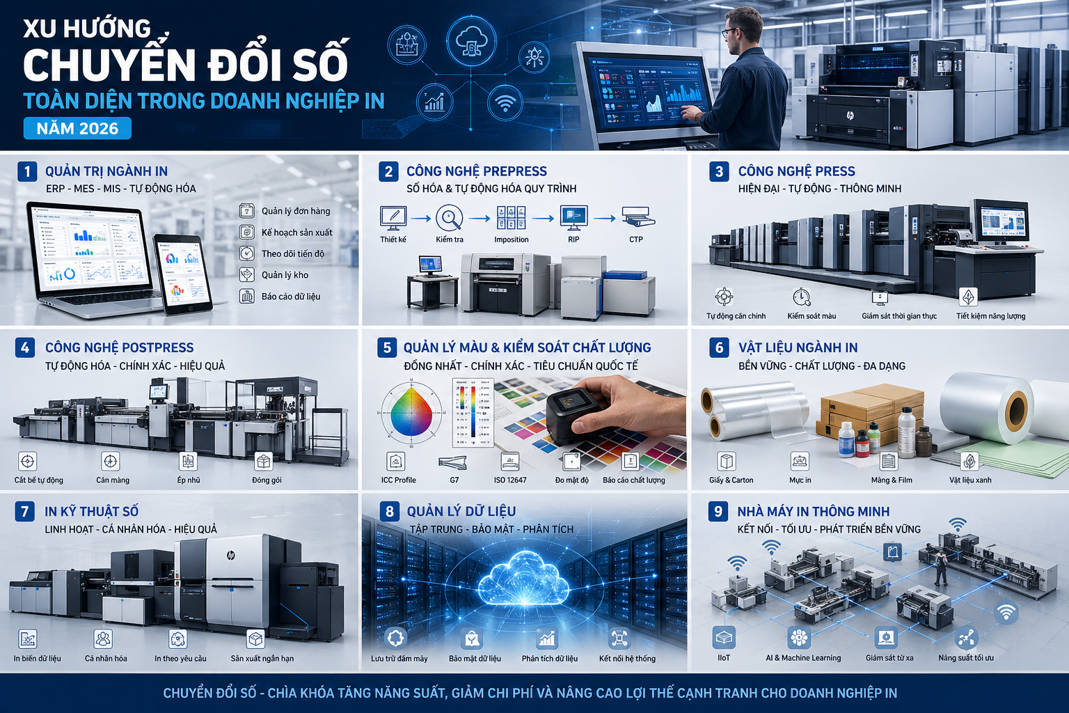 Năm 2026 được xem là cột mốc quan trọng của ngành in toàn cầu khi hàng loạt xu hướng mới đồng loạt tăng tốc: in kỹ thuật số phát triển mạnh mẽ, AI tham gia kiểm soát chất lượng, robot thay đổi mô hình vận hành nhà máy, quản lý màu và dữ liệu trở thành yếu tố sống còn, trong khi các tiêu chuẩn môi trường và yêu cầu phát triển bền vững ngày càng khắt khe hơn. Nhà in hiện đại không chỉ là nơi sản xuất sản phẩm in, mà đang dần trở thành một hệ sinh thái thông minh — nơi mọi công đoạn từ prepress, press đến postpress đều được kết nối, kiểm soát và tối ưu bằng dữ liệu thời gian thực.
