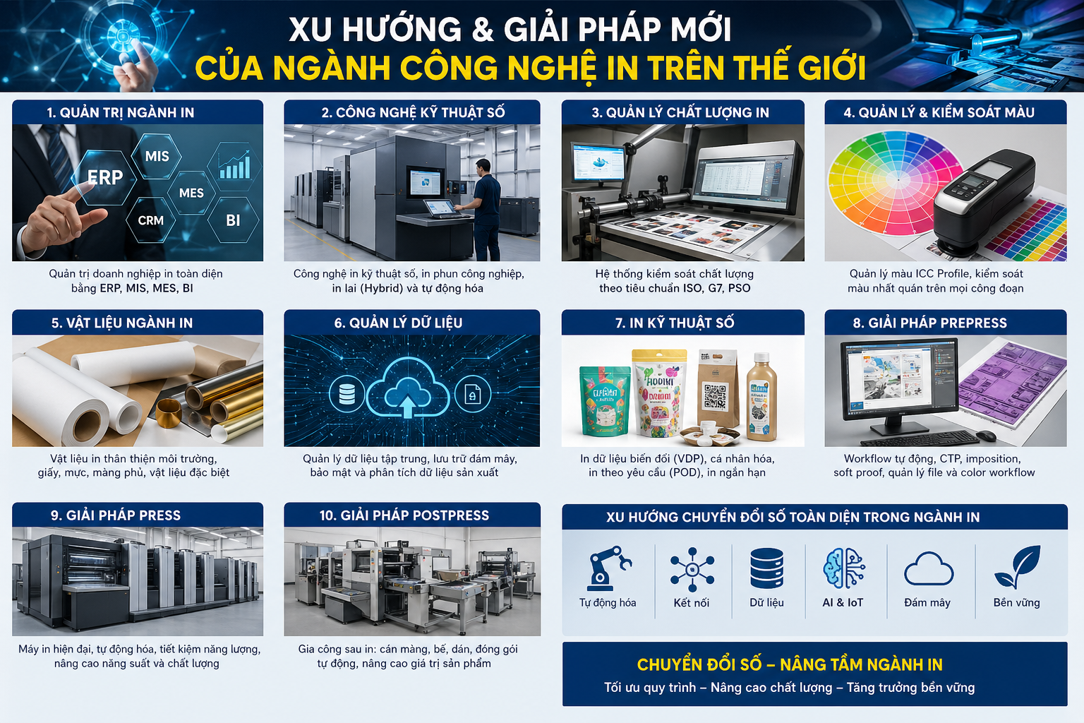 Nội dung bài viết này mô tà những xu hướng công nghệ nổi bật nhất của ngành in thế giới và các giải pháp thực tiễn đang được triển khai bởi những tập đoàn hàng đầu như Heidelberg, HP Indigo, Komori, Bobst cùng nhiều doanh nghiệp tiên phong trong lĩnh vực in công nghiệp. Từ hệ sinh thái Prinect Touch Free của Heidelberg, mô hình Nonstop Digital Printing của HP Indigo, giải pháp KP-Connect Pro của Komori cho đến nền tảng BOBST Connect và Digital Master của Bobst — tất cả đều cho thấy một điểm chung: chuyển đổi số không còn là khái niệm tương lai, mà đang là hiện thực vận hành mỗi ngày trong các nhà máy in hiện đại.